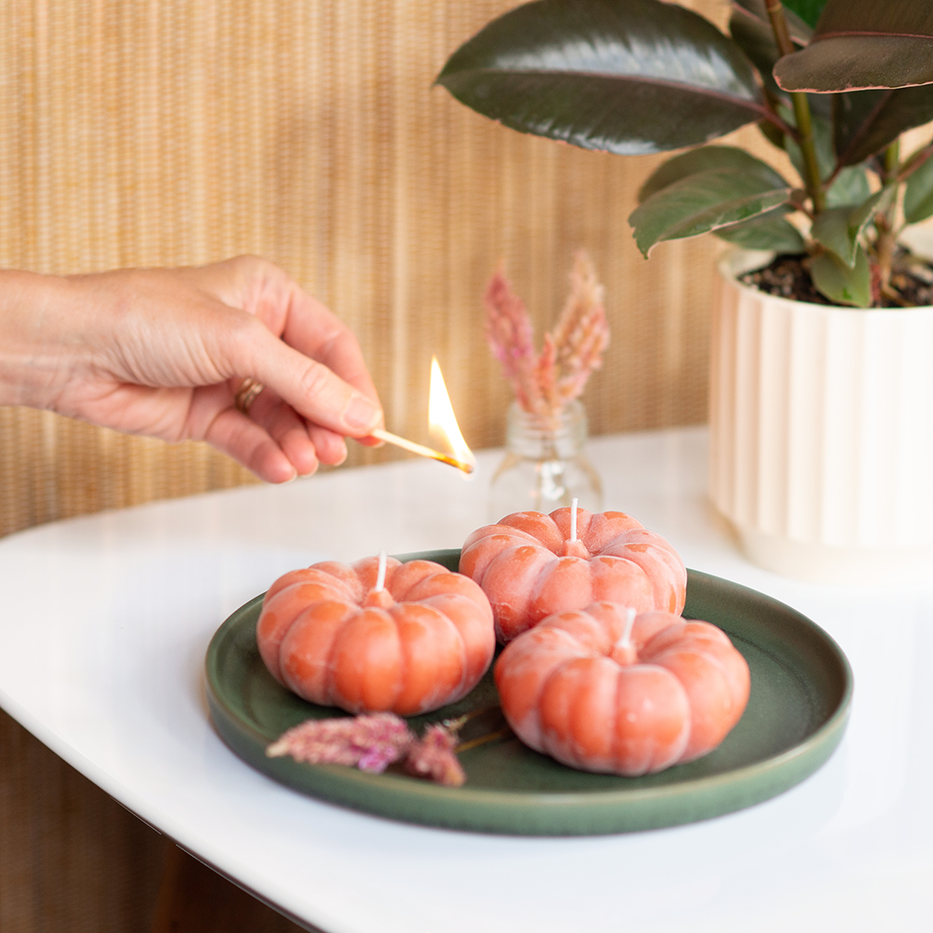 We hope you’ll enjoy these adorable little candles, scented with an all-natural plant-based pumpkin spice inspired scent blend we're calling Harvest Moon. Cozy, cute, and clean-burning!